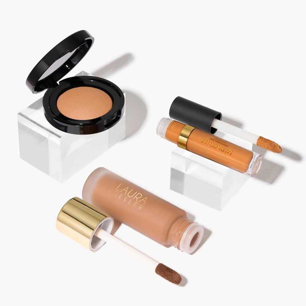 LAURA GELLER NEW YORK Redness Care Kit: Double Take Liquid Foundation, Deep + Ideal Fix Concealer, Deep + Baked Blurring and Setting Powder, Tan/Deep